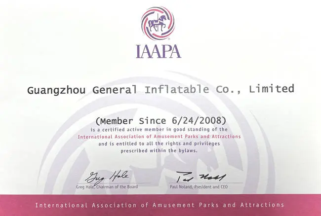 Our inflatables are certified to be in conformance with CE, EN71, EN14960, ASTM, and ISO standard after tested by SGS, also confirm with Canadian TSSA and Australian AS3533.4.1-2005.